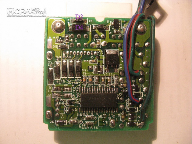 Убедились, что с концевиков дверей приходит земля и есть контакт с плафоном, т.е. с цепями автомобиля у нас ОК, переходим к разборкам с блоком центрального замка. Вынимаем плату из корпуса, перед нами должна открыться следующая картина (при пристальном изучении оказалось, что плата имеет двухслойную разводку дорожек.