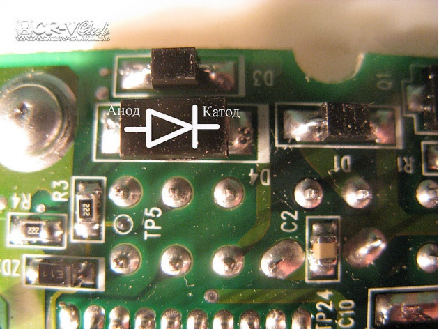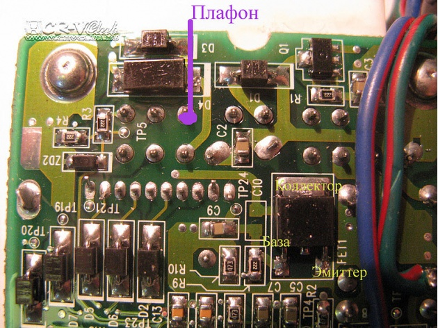 — анод диода должен звониться (иметь хороший контакт) с контактом «плафон».